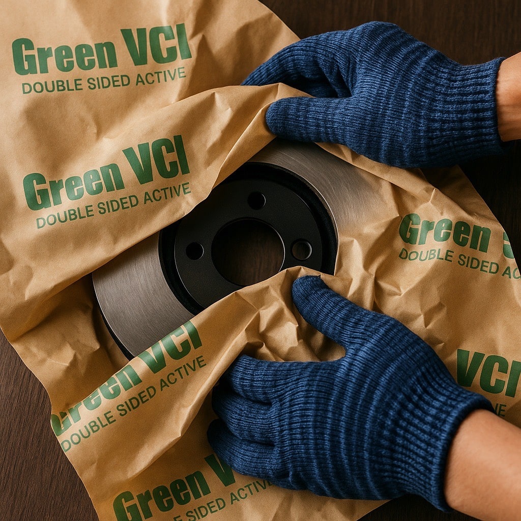 GreenVCI คือ บรรจุภัณฑ์ป้องกันสนิม ที่ใช้เทคโนโลยี VCI – Vapor Corrosion Inhibitor พูดง่าย ๆ คือมันเป็นวัสดุที่ ปล่อยโมเลกุลป้องกันสนิมออกมาเคลือบผิวโลหะแบบมองไม่เห็น ช่วยป้องกันสนิมโดยที่ไม่ต้องทาน้ำมัน ไม่ต้องล้างหลังเปิดใช้งาน สะอาดและประหยัดแรงมาก ๆ