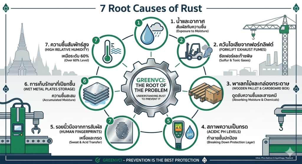 ในฐานะฝ่ายจัดซื้อหรือวิศวกรโรงงาน หลายครั้งที่เราสงสัยว่า “ทำไมห่อของอย่างดีแล้ว สนิมยังขึ้น?” จริงๆ แล้วสนิมมันฉลาดและมีทางเข้าถึงชิ้นงานเราได้ถึง 7 ทางหลักๆ ดังนี้ครับ:
